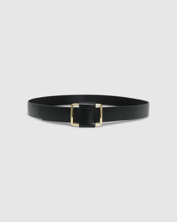 A sleek staple with a modern edge. This leather belt features a smooth finish and a minimal silhouette, elevated by a polished gold-tone buckle. Designed to pair effortlessly with denim, tailoring, or cinched over dresses.