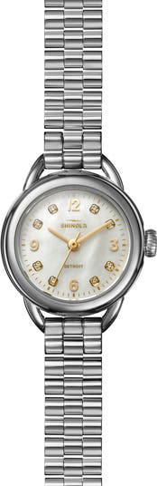 A slimmer, sleeker version of the brand's popular Runwell, the Runabout watch features the same quality components 'under the hood,' like the brand's Detroit-assembled, Swiss-manufactured Argonite quartz movement, and then polishes the presentation a bit more with a mother-of-pearl dial set with round-cut diamond markers.