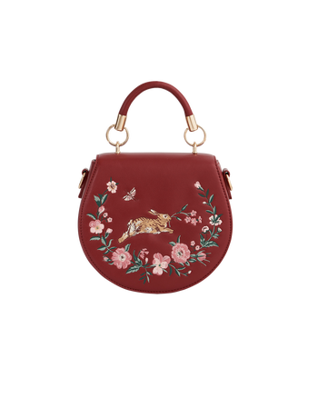 The intricately embroidered scene on our cherry red Saddle Bag is bound to put a spring in your step with its running bunny and wreath of pink flowers. The bag is crafted from soft vegan leather with a removable shoulder strap and gold-toned detailing.