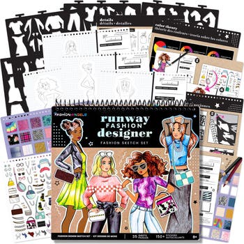 FASHION ANGELS RUNWAY FASHION DESIGNER PORTFOLIO. Unleash your inner fashion designer with this all-in-one Fashion Angels Sketch Portfolio! With 35 sketch sheets featuring pre-printed model silhouettes, this set makes it easy to create stylish looks while boosting creative and artistic skills. With a huge variety of accessories to mix and match, your design options are endless! Explore limitless design possibilities with included instructions, color theory guides, and printed fabric swatches for extra inspiration. The spiral-bound format is perfect for on-the-go creativity—just toss it in a tote or backpack! Whether you're refining your fashion flair or starting your first portfolio, this set makes the perfect gift for any fashionista. FASHION ANGELS, founded in 1996, is a leading designer and manufacturer of award-winning products for tween girls, including arts & crafts, jewelry, stationery and lifestyle accessories, providing them with the tools and inspiration to develop creativity and confidence. INCLUDES: 4 Stencil Sheets, 1 Foil and 1 Regular Sticker Sheet, 5 Intro Pages, and 35 Design Sheets.