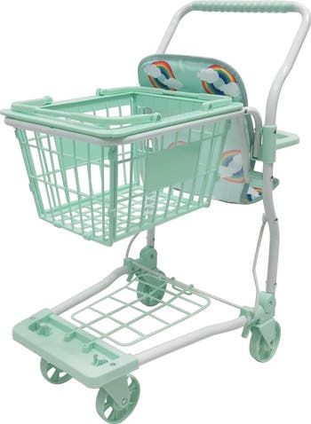 ROMA PRAMS: RUPERT - SHOPPING TROLLEY - MINT - The Roma Rupert Dolls Shopping Trolley brings playful shopping adventures to life for children aged 3 and up. Featuring a cheerful rainbow print and clean white frame with a refreshing mint finish, it’s a fun and stylish accessory for little shoppers. The coordinating removable shopping basket adds extra realism, offering space for pretend groceries while also providing a seat for a favorite doll or teddy. Lightweight and easy to maneuver, the sturdy frame includes front swivel wheels for smooth steering wherever the fun leads. The collapsible design allows the trolley to fold down compactly when playtime is done—great for taking along on outings or storing away neatly. Encouraging imaginative role-play, this trolley helps build social skills, confidence, and responsibility through everyday pretend shopping scenarios. Pair it with the matching Rupert pram and umbrella buggy to complete the collection! KEY FEATURES: Removable shopping basket for doll seating and groceries. Cheerful rainbow print and mint color scheme. Sturdy, lightweight frame with swivel wheels for easy pushing. Collapsible design for convenient storage and travel. Perfect for imaginative and social play. DIMENSIONS: Height: 26.4" (67 cm), Length: 15.2" (38.5 cm), Width: 11.2" (28.5 cm). A delightful addition to any playroom, the Roma Rupert Dolls Shopping Trolley makes every shopping trip feel magical! NOTE: Doll is NOT included.