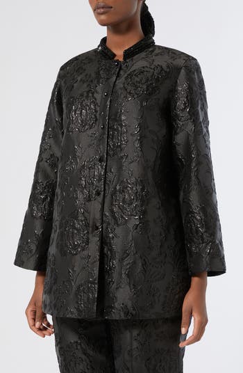 Sparkly rhinestones and beads highlight the collar of this elegant night-out jacket featuring shimmery jacquard flowers in a tunic-length silhouette.