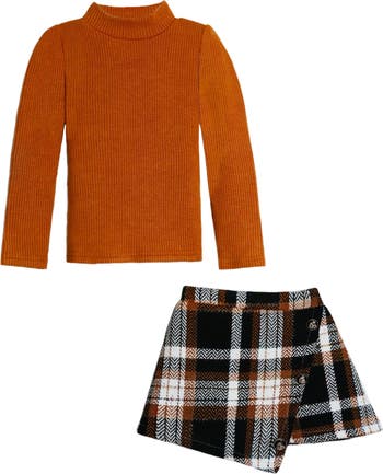 Trendy rust turtleneck top and plaid skort set for a chic and stylish look.Trendy rust turtleneck top and plaid skort set for a chic and stylish look.