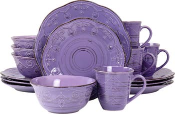 Elama Rustic Birch 16 Piece Stoneware Dinnerware Set, Main, color, Purple
