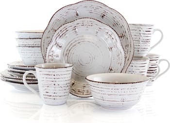 Enjoy the Elama Rustic Birch 16 Piece Stoneware Round Dinnerware Set at any home dinner table setting. The white dishes feature an organic and rustic birch wood like design along the exterior. This woodsy look is accompanied with an enchanting embossed pattern. Stoneware construction of each dish is ideal for special occasions and durable for every day use. Each piece is microwave safe for quick reheating and dishwasher safe for easy cleaning.