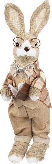This whimsical bunny is dressed to impress, sporting a dapper suit with a tasteful bowtie and stylish glasses. With its rustic brown and tan color palette, this adorable rabbit brings a touch of rustic elegance to any Easter celebration or springtime display. Whether placed on your mantel, tabletop, or shelf, this adorable rabbit effortlessly enhances the holiday atmosphere and adds a delightful touch to your Easter decor. Product Features: Boy rabbit Easter Figure Dressed in a brown plaid jacket, tan vest and pants Accented with a bow tie, glasses and a book Ears are accented with burlap insets For indoor use only Dimensions: 16.25“H X 4"W X 6.5"D Materials: sisal/burlap/fabric/plastic/foam
