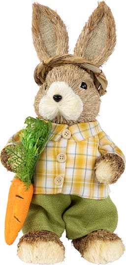 Add a dash of rustic elegance to your Easter decor with this enchanting rabbit figure. This delightful figurine captures the essence of Spring and the Easter season, adorned in a yellow plaid button-up shirt and green pants. Its burlap ears add a touch of natural beauty, while a whimsical hat made of rustic dry grass blades completes the picture-perfect ensemble. With a carrot in hand, this endearing rabbit is ready to hop and fill your space with holiday cheer. Product Features: Boy rabbit with carrot standing Easter figure Dressed in a yellow plaid shirt and and moss green pants Accented with rustic dry grass blades hat and a carrot For indoor decorative use only Dimensions: 14“H X 7"W X 6"D Materials: fabric/foam/plastic/burlap