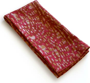 These rustic orange napkins are block printed by hand on handwoven organic cotton fabric using carved wooden blocks. Featuring an intricate pattern inspired by rainfall, they are dyed with natural dyes to create a rich and warm aesthetic for your dining table. They go really well with our Indian Summer and Rajkumari Tablecloths. • hand block printed • hand dyed in natural dyes • color: orange with golden beige accents • fabric: organic cotton • size: 19" x 19" • includes: Set of 4 * Please note that slight color variations may occur, as each fabric absorbs natural dyes differently—a beautiful part of the handmade process. --------------------------------------- ABOUT BLOCK PRINTING Block Printing is an ancient printing technique especially with the use of vegetable dyes. After the wooden block is carved with the pattern, the fabric is then prepared with multiple washes to make the fiber ready to take the dye. With the process of multiple printings and washing before the final product is placed in a dye bath of flowers and barks, the fabric goes through the hands of the block printer and dyer with utmost care. That same care is passed onto the consumer who wishes to take part in this process of honoring the craft and the earth that gives us so much.