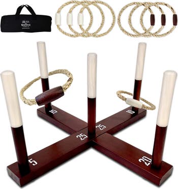 - WIDE-GRIP HANDLES – Includes 6 vintage-style brown and white rings. Crafted with wide wooden grips and extra-firm rope to glide around the posts with ease. Designed for longer tosses, eagle-like aim, and bigger smiles!