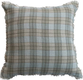 - A cozy woven cotton double cloth pillow featuring a multicolor plaid pattern with chambray back and frayed edges