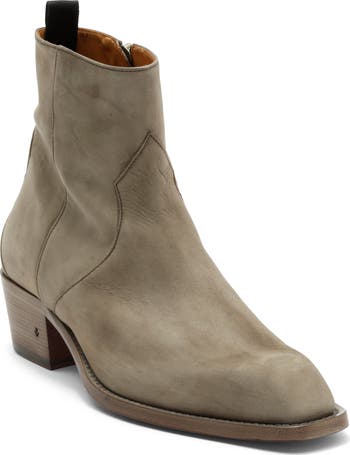 A plain squared toe and diamond-topped vamp let you go casual or elevated in a boot made of burnished Italian leather with a full-length side zipper for easy on and off. Minimal detailing and a traditional stacked heel give it easy versatility across your going-out and kicking-back wardrobes.