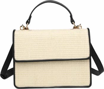 - Exterior Details: Woven Straw Design with Vegan Leather Details, Adjustable/Detachable Crossbody Strap, Hidden Back Pocket, Stud and Tassel Details, Gold Hardware