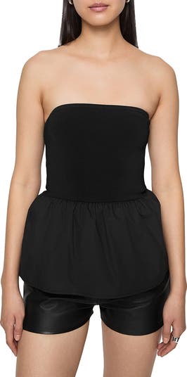 Bare your shoulders in this strapless top fashioned with a fitted knit bodice that flows into a playful, gathered cotton-poplin peplum.