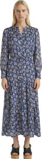 Long dress adorned with light printed flowers on a dark background, enhanced with a lurex thread. Its discreet pleats and ruffled skirt offer a fluid drape, while the elasticated waist structures the silhouette. It is buttoned along the entire length.