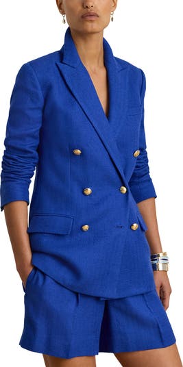 Crested buttons and a double-breasted silhouette bring timeless style to a bold blue blazer polished with peaked lapels.