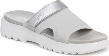A contoured footbed and flex grooves in the outsole allow for natural movement in this walkable slide sandal cushioned by soft EVA foam.
