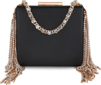 Get ready to shine with the crystal fringe box clutch. This handbag is perfect for adding a touch of glamour to any occasion. The mix of crystal and textural metal fringe catches the light beautifully, creating a dazzling effect. With its gold-tone hardware and jewel crystal chain, this hand-held box clutch offers a sophisticated and youthful vibe.