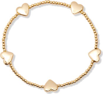 Polished heart stations sweeten this stackable beaded stretch bracelet plated in warm 14-karat gold with a high-shine finish.