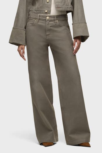 The Rylee Low-Rise Loose Pant in Washed Olive is a low-rise loose fit that is meant to be worn relaxed and dropped. This pair features a 32" inseam and is made of a rigid canvas fabric in a distressed, dark olive green color. It is finished with a novelty button with a pearl inset at the waistband closure. For a looser fit, we recommend sizing up. Product DetailsRise: 10.5", Inseam: 32", Leg Opening: 23"Fit & CareContent: 100% CottonMachine wash cold gentle cycleOnly non-chlorine bleach when neededTumble dry lowMedium iron if needed
