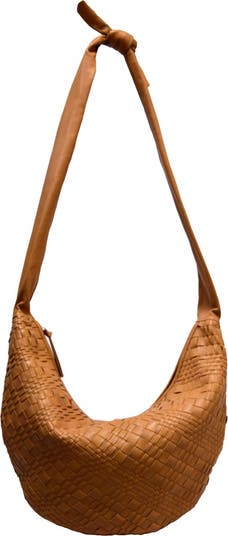 Large hobo in camel woven leather with knotted shoulder strap. Zip top closure. Fully lined with inside zip pouch.