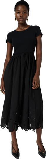 The Rynah Dress, featuring a thin-ribbed t-shirt-style top and a flowing skirt that adds movement. The contrast between the fitted top and the airy bottom creates a feminine and modern silhouette. The skirt's bottom is embroidered and scalloped. Dress crafted in cotton.
