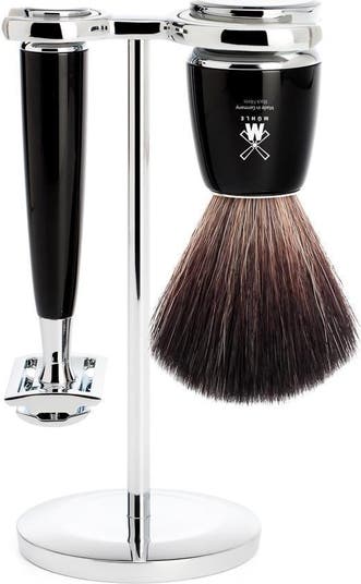3-piece shaving set without bowl, including: Black Fiber Shaving Brush Closed Comb Safety Razor Chrome-plated Metal Stand RYTMO is a popular choice within our INTRO range and it's easy to see why; the design is both eye-catching and timeless. With a classic conical form, interrupted by distinctive lines at the chrome plated top and base it is like a measured musical composition. The Material:Made from high-grade resin, this RYTMO set delivers on both durability and beauty. Presented in classic black with chrome metal highlights, the process of creating this set begins with each handle being turned out of solid resin rods. All individual pieces are then polished in several passes, giving the surface its characteristic gleam and securing its beauty for many years to come. Black Fiber:Somewhat softer than natural hair, the synthetic Black Fiber offers a fantastic vegan alternative to Pure Badger. Closely replicating the quality of Pure Badger, a Black Fiber bundle offers a somewhat more durable and lower maintenance brush.Still producing a particularly creamy shaving lather, Black Fiber is manufactured mechanically according to the same high standards applied to all MÜHLE products. The Razor: A real investment piece, this razor supersedes the need for single-use plastic. Growing concern in the effects of disposable plastic makes this a great choice for the environmentally conscious, reducing both unnecessary plastic waste and unwelcome environmental impacts, without compromising on precision.Blades are easily replaced by unscrewing the head of the Safety Razor. Replacement blades can be purchased from us, we recommend the rust-proof MÜHLE razor blades, a perfect match for this timeless razor.