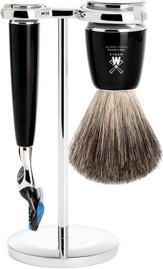 3-piece shaving set without bowl, including: Pure Badger Shaving Brush Gillette Fusion Razor Chrome-plated Metal Stand RYTMO is a popular choice within our INTRO range and it's easy to see why; the design is both eye-catching and timeless. With a classic conical form, interrupted by distinctive lines at the chrome plated top and base it is like a measured musical composition. The Material:Made from high-grade resin, this RYTMO set delivers on both durability and beauty. Presented in classic black with chrome metal highlights, the process of creating this set begins with each handle being turned out of solid resin rods. All individual pieces are then polished in several passes, giving the surface its characteristic gleam and securing its beauty for many years to come. Pure Badger:Recognisable by its relatively dark colouring, Pure Badger represents the basic quality among natural hair types. Recommended for those who desire a stronger massage effect, Pure Badger hairs are somewhat thicker but still maintain their characteristic flexibility and softness. Manufactured mechanically according to the same high standards applied to all MÜHLE products. The Razor:Simple and safe handling, Gillette Fusion is ideal even for newcomers. It ensures a close and gentle shave with its five-blade system and precision edging blade located on the back of the cartridge. Replacement blades are available from retailers worldwide.