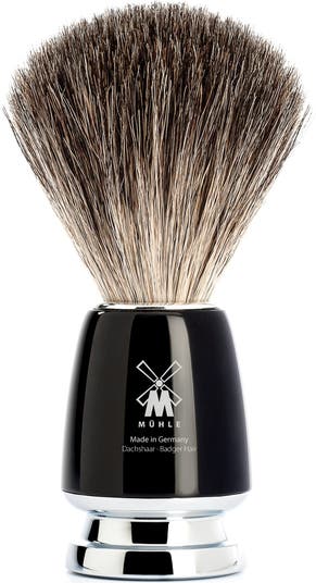 RYTMO is a popular choice within our INTRO range and it's easy to see why; the design is both eye-catching and timeless. With a classic conical form, interrupted by distinctive lines at the chrome plated top and base it is like a measured musical composition. Made from high-grade resin, this RYTMO brush delivers on both durability and beauty. Presented in classic black with chrome metal highlights, the process of creating this shaving brush begins with each handle being turned out of solid resin rods. All individual pieces are then polished in several passes, giving the surface its characteristic gleam and securing its beauty for many years to come. Pure Badger:Recognisable by its relatively dark colouring, Pure Badger represents the basic quality among natural hair types. Recommended for those who desire a stronger massage effect, Pure Badger hairs are somewhat thicker but still maintain their characteristic flexibility and softness. Manufactured mechanically according to the same high standards applied to all MÜHLE products. Measurements: Ring size M: 21 mm
