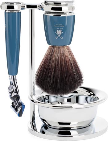 4-piece shaving set with bowl, including: Black Fibre Shaving Brush Gillette Fusion Razor Chrome-plated Soap Dish Chrome-plated Metal Stand RYTMO is a popular choice within our INTRO range and it's easy to see why; the design is both eye-catching and timeless. With a classic conical form, interrupted by distinctive lines at the chrome plated top and base it is like a measured musical composition.The MaterialMade from high-grade resin, this RYTMO set delivers on both durability and beauty. Presented in petrol blue with chrome metal highlights, the process of creating this set begins with each handle being turned out of solid resin rods. All individual pieces are then polished in several passes, giving the surface its characteristic gleam and securing its beauty for many years to come.Black FibreSomewhat softer than natural hair, the synthetic Black Fibre offers a fantastic vegan alternative to Pure Badger. Closely replicating the quality of Pure Badger, a Black Fibre bundle offers a somewhat more durable and lower maintenance brush.Still producing a particularly creamy shaving lather, Black Fibre is manufactured mechanically according to the same high standards applied to all MÜHLE products.The RazorSimple and safe handling, Gillette Fusion is ideal even for newcomers. It ensures a close and gentle shave with its five-blade system and precision edging blade located on the back of the cartridge.Replacement blades are available from retailers worldwide.