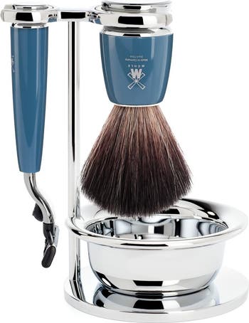 4-piece shaving set with bowl, including: Black Fibre Shaving Brush Gillette Mach3 Razor Chrome-plated Soap Dish Chrome-plated Metal Stand RYTMO is a popular choice within our INTRO range and it's easy to see why; the design is both eye-catching and timeless. With a classic conical form, interrupted by distinctive lines at the chrome plated top and base it is like a measured musical composition.The MaterialMade from high-grade resin, this RYTMO set delivers on both durability and beauty. Presented in petrol blue with chrome metal highlights, the process of creating this set begins with each handle being turned out of solid resin rods. All individual pieces are then polished in several passes, giving the surface its characteristic gleam and securing its beauty for many years to come.Black FibreSomewhat softer than natural hair, the synthetic Black Fibre offers a fantastic vegan alternative to Pure Badger. Closely replicating the quality of Pure Badger, a Black Fibre bundle offers a somewhat more durable and lower maintenance brush.Still producing a particularly creamy shaving lather, Black Fibre is manufactured mechanically according to the same high standards applied to all MÜHLE products.The RazorAs one of the most frequently used shaving systems in the world, Gillette Mach3 blades guarantee a close and comfortable shave.Compatible with Gillette Mach3 and Mach3 Turbo blades, replacement blades are available from retailers worldwide.