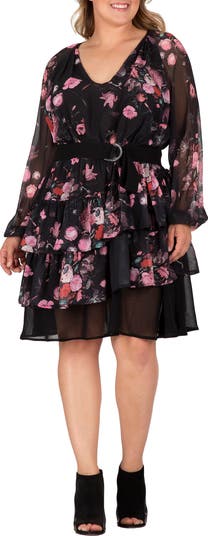 A solid ring belt cinches the waist of this flowery georgette frock designed with a layered ruffle skirt.