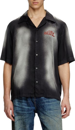 DIESEL's rugged, industrial DNA shows through in this smooth, breathable twill camp shirt with retro character care of high-contrast fading and weathered logo art.