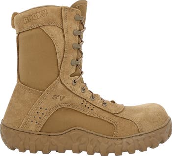 The ROCKY® S2V Side Zip Composite Safety Toe Tactical Military Boot protects your foot, stands up to tough conditions and comfortable to wear all day long. Featuring a YKK Side Zip making it easy to get on and off. The Triple Stitched Upper is made of flash and water resistant leather, and 1000-denier Coated Flame Resistant CORDURA. Rocky Sieve Technology Drainage Vents circulate Air in and Push water out drying your feet quickly. Secure and Comfortable, The Rocky S2V has Roll-Stop Ankle Stability and Stretch LYCRA securing your feet in place. A Vibram Outsole with proprietary high walls and shock absorbing polyurethane midsole further enhance stability.