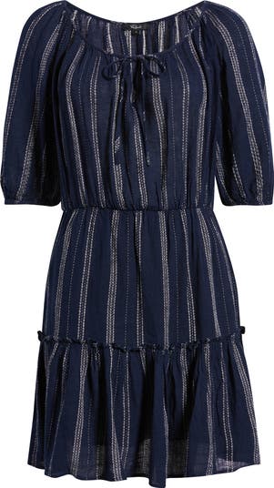 Stitched stripes enliven this light and lovely mini framed by elbow-length sleeves and a flouncy frill-trimmed hem.