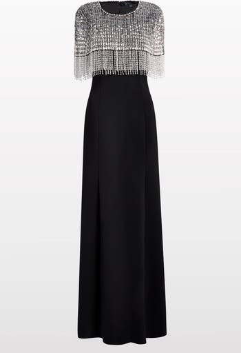 This gown exudes understated elegance, defined by its clean, floor-sweeping silhouette contrasted with a statement crystal fringe cape overlay. The sleek strapless base creates a refined canvas, while the draped embellishment introduces movement, sparkle, and couture-level detail. The structured yet fluid design ensures a commanding presence, balancing simplicity with high-impact glamour. Perfect for gala dinners, formal receptions, and red carpet occasions, this gown guarantees a striking and memorable entrance.