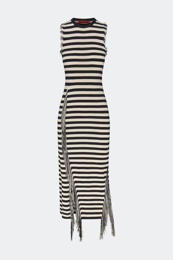 Soft knit midi dress designed with a close, flattering fit through the body. Finished with subtle asymmetrical slits accented by delicate fringe at the slits and armholes for added texture and detail.