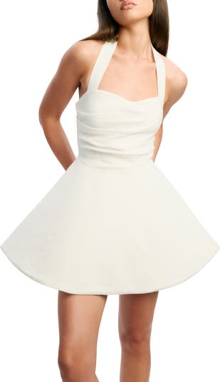A flared skirt brings va-va-volume to a playful minidress cut from lightweight linen and sweetened with a halter neck.