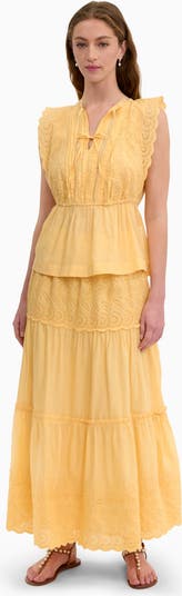 Designed for warm, sunlit days, this voile peplum blouse features scalloped embroidered cutwork panels and delicate lace inserts for added texture. A softly elasticated waist defines the silhouette, while the slit neckline with tie detail brings an effortless, feminine finish. Wear with white denim or the matching skirt for an event worthy ensemble.