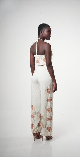 - Silhouette: Long wide-leg jumpsuit with ruched bust and halter neckline