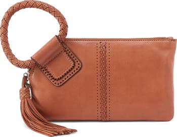 Decorative whipstitching and geometric perforations bring dimension to a slim leather wristlet featuring a circular handle and swingy fringe tassel.