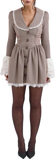 In a design inspired by English riding heritage, this mini makes a retro romantic statement in a button-up design with a deeply cut neckline and lace all around the edges.