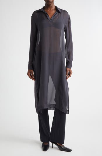 Paloma Lanna contemplates clothing as protection for fall '25, building everyday armor from soft separates like this free-flowing tunic top cut from sheer, lightweight silk.