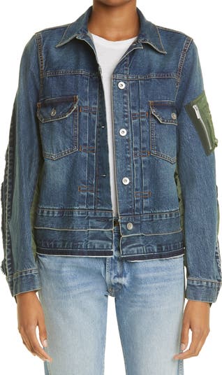 Creative director Chitose Abe uses her signature hybrid splicing to craft this innovative mash-up of a classic denim trucker and military MA-1 flight jacket.