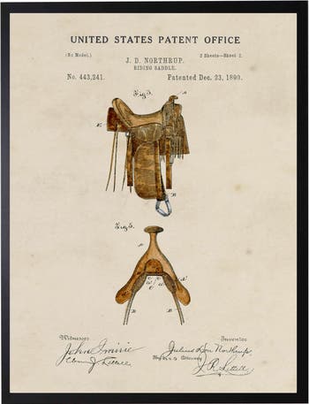 This vintage-inspired print, framed in a black wooden frame, features a saddle patent. Sized at 16 inches by 20 inches, this made in the USA frame makes for a beautiful addition to any wall.
