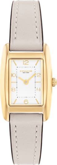 Mixed markers complement the minimalist design of a rectangular dial on a sleek and polished leather-strap watch.