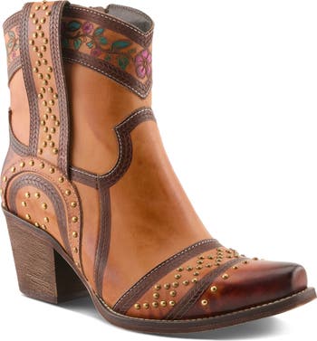 Etched flowers and gleaming studs put a chic spin on this Western boot framed by a burnished snip toe and lifted by a textured block heel.