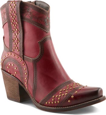 Etched flowers and gleaming studs put a chic spin on this Western boot framed by a burnished snip toe and lifted by a textured block heel.