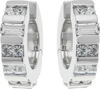 Bring a powerful glow to your lobes with these huggies that alternate baguette-cut and circular crystals.