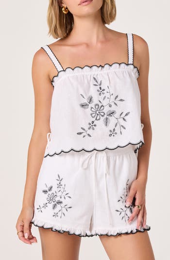 Make a fresh, summery statement in this linen-blend camisole featuring scalloped edges and intricate floral embroidery.