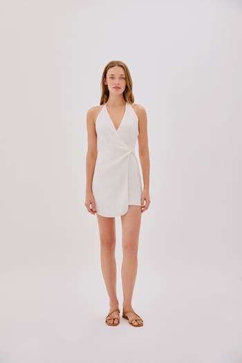 Meet Sadie, our chic and stylish mini wrap dress. Cut from a rich navy blue fabric, it is detailed with a contrast stitch red piping along the edges, adding a bold and modern touch. The dress is tied at the neck with a halterneck design, creating an elegant and sophisticated look. The V-neckline adds to its femininity, creating a sleek and flattering silhouette. Perfect for a casual summer outing, this 100% linen dress combines classic elements with a contemporary twist.
